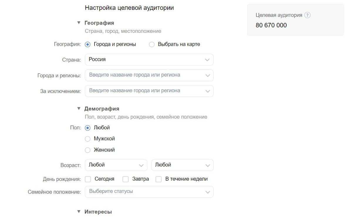 Таргетированная реклама имеет множество параметров настройки аудитории, которой будет показываться реклама, мы перечислим самые важные из них: