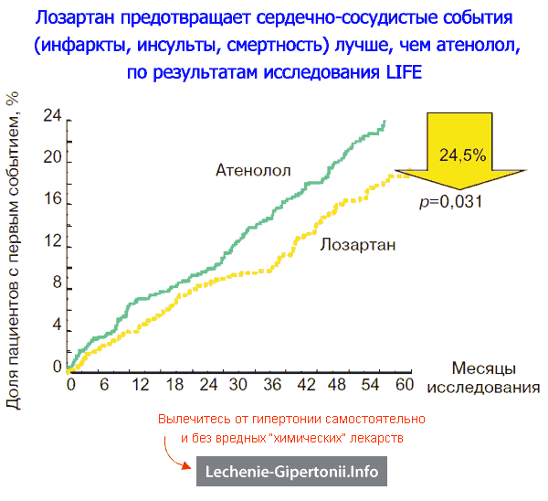 В исследовании LIFE (Losartan intervention for endpoint reduction in hypertension) сравнивали эффективность лозартана и атенолола