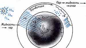 Солнечное тепло испаряет влагу с земной поверхности, конвективные потоки и диффузия позволяют парам достигнуть высоких атмосферных слоев. По мере движения вверх температура падает, пары конденсируются и образуются облака. Внутри облаков происходит формирование капель или снежинок и градин. Атмосферные осадки выпадают на землю в виде дождя или снега. В зависимости от времени года вода на земле может превратиться в лед, или наоборот, происходит таяние снега. На этом цикл замыкается.
