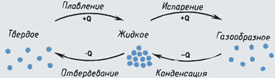 Процессы превращения твердого вещества в жидкое и жидкого в газообразное сопровождаются поглощением теплоты, т.к. для разрыва связей между частицами требуется дополнительная энергия.