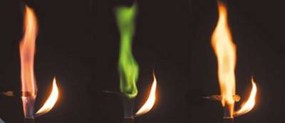 Различные цвета пламени во время горения солей марганцовки, медного купороса и поваренной соли