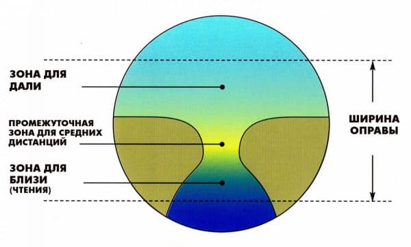 Прогрессивные линзы внешне похожи на обычные монофокальные линзы, так как не имеют чётких границ между оптическими зонами. Вместе с тем в прогрессивных линзах предусмотрены три сегмента обзора. Верхняя зона предусмотрена для дали, широкая промежуточная зона – для просмотра монитора компьютера, и небольшая зона в нижней части линзы предназначена для фокусировки на близко расположенных объектах.
