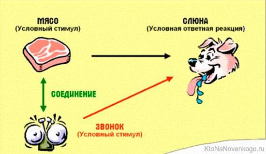 Естественно, у любой нормальной собаки при виде мяса начинает течь слюна, а на звук колокольчика собака, в лучшем случае, покоситься. Но если повторить несколько раз одновременно получение пищи + звук колокольчика, то, в какой-то момент только позвонив в колокольчик, мы увидим, как у собаки тоже пойдет слюна, хотя никакого мяса рядом нет.