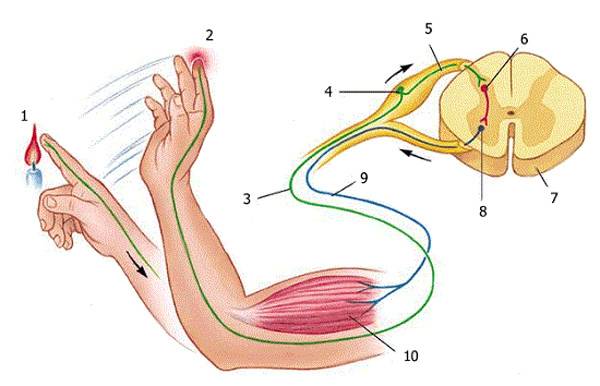 - И условные, и безусловные рефлексы построены на работе рефлекторной дуги, которая состоит из стимула (того фактора внешней среды, который воздействует на организм), рецептора, воспринимающего стимул, нейрон центральной нервной системы и, наконец, эффектор или орган (кань, мышца), реагирующая на стимул. Заключительным звеном в цепи является реакция организма;