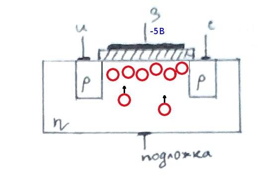 Как же в этом случае идёт ток? Принцип тот же: минус на затворе притянет неосновные носители, положительно заряженные дырки. Так что они образуют небольшую область с положительной проводимостью — то есть «виртуальный» канал, который соединит исток и сток. И то, что их притянуло поле, перпендикулярное направлению канала, не мешает им двигаться вдоль канала, создавая электрический ток. Это как красивая витрина притягивает случайных прохожих, но не мешает им двигаться вдоль витрины.