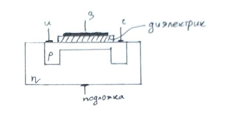 У полевого транзистора этого типа основу кристалла составляет слабо легированная зона n. Она называется подложкой. В ней созданы сильнолегированные зоны p (то есть там много основных носителей заряда) и тонкий канал между ними. А затвор вообще изолирован — он отделён от канала тонким слоем диэлектрика. Структура затвора дала название этому виду транзисторов: МДП (металл-диэлектрик-полупроводник). Ещё их иногда называют МОП (металл-окисел-полупроводник), поскольку в качестве диэлектрика обычно используется слой диоксида кремния. Ну а по-английски это MOSFET (Metal-Oxid-Semiconductor-Field-Effect-Transistor).