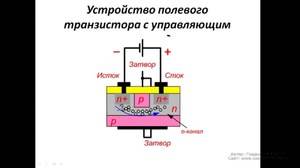 Такой транзистор состоит из полупроводника с определённой проводимостью и двух областей, помещённых в него с противоположной проводимостью. При подаче напряжения на затвор между этими двумя областями появляется пространство, через которое протекает ток. Это пространство называется каналом. Ширина этого канала регулируется напряжением, которое мы подаём на затвор. Соответственно, можно увеличивать и уменьшать ширину канала и управлять протекающим током.