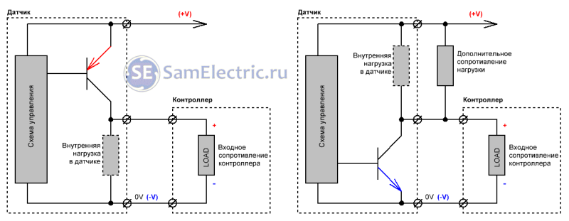 Итак, схема слева. Предположим, что тип датчика — НО. Тогда (независимо от типа транзистора на выходе), когда датчик не активен, его выходные «контакты» разомкнуты, и ток через них не протекает. Когда датчик активен, контакты замкнуты, со всеми вытекающими последствиями. Точнее, с протекающим током через эти контакты)). Протекающий ток создает падение напряжения на нагрузке.