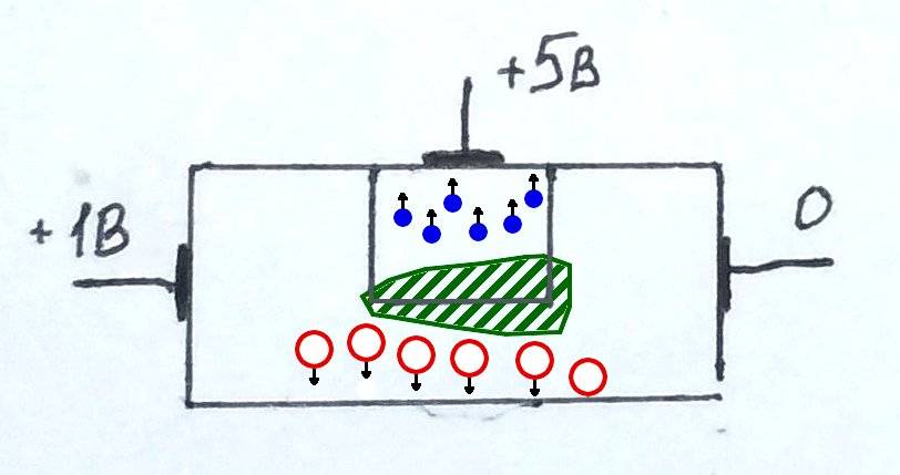Итак, здесь у нас появился канал, соединяющий исток и сток (аналоги эмиттера и коллектора). Хоть это и полу-, но всё же проводник, сопротивление у него небольшое. Значит, если к затвору (управляющему электроду) не приложен никакой потенциал, ток через полевой транзистор всё равно будет течь