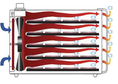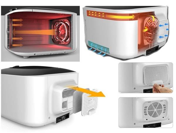В первом варианте нагнетание воздуха будет происходить в результате работы нагревающей спирали вентилятора — чаще всего он располагается на задней панели устройства.