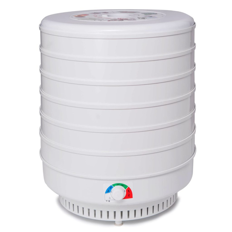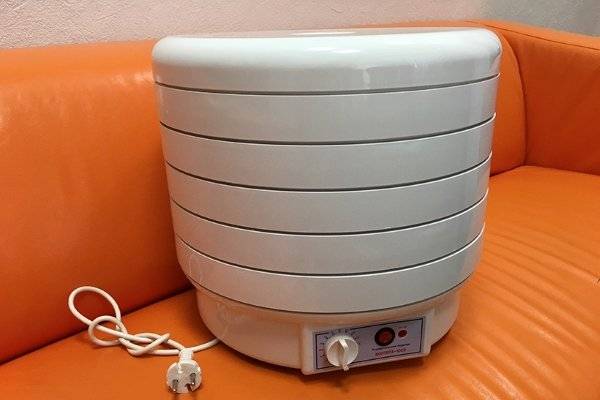 Электрические сушилки для фруктов и овощей обладают цилиндрической формой и состоят из нескольких съемных ярусов-поддонов, которые можно переставлять с места на место. Вентилятор расположен обычно в нижней части корпуса и прогоняет воздух через сетчатые лотки. Конструкция простая, но добиться равномерного просушивания с ее использованием довольно трудно. Температура воздушного потока внизу и вверху устройства различается.
