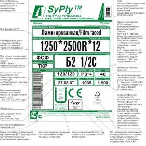 К маркировке материала и сорта добавляют буквенный символ, который означает степень обработки листа. Помимо этого, обязательно указывается класс эмиссии формальдегида. Выпускают фанеру данного вида толщиной 4-40 мм. Габариты фанерного полотна ФСФ составляют: 1525х1525, 1220х2440, 1250х2500 мм.