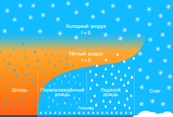 Осадки, которые поначалу выпадают в виде снега, постепенно переходят в фазу дождя. Но поскольку у земли сохраняется минус, то при соприкосновении с поверхностями на ней они сразу же замерзают.