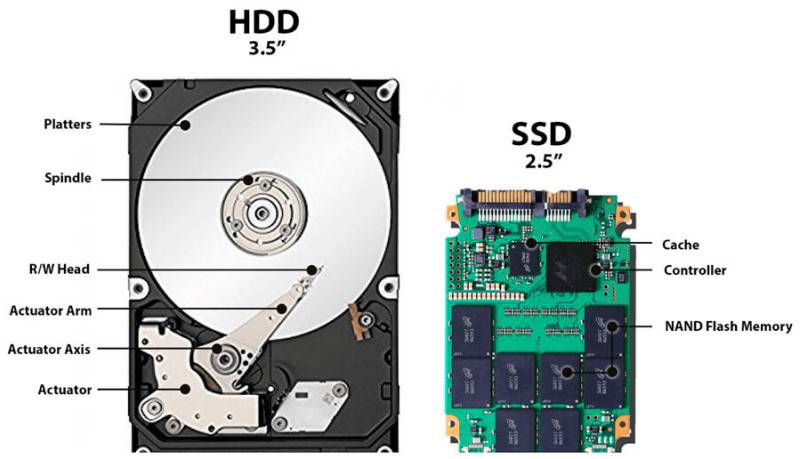 По большому счету, основное различие заключается в способе хранения данных. Так в HDD используется магнитный способ, то есть, данные записываются на диск путем намагничивания его областей. В SSD вся информация записывается в специальный тип памяти, который представлен в виде микросхем.