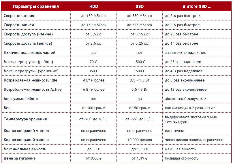 | HDD весит больше. | SDD-накопители легче жестких дисков, поскольку у них нет вращающегося шпинделя и зеркала. |