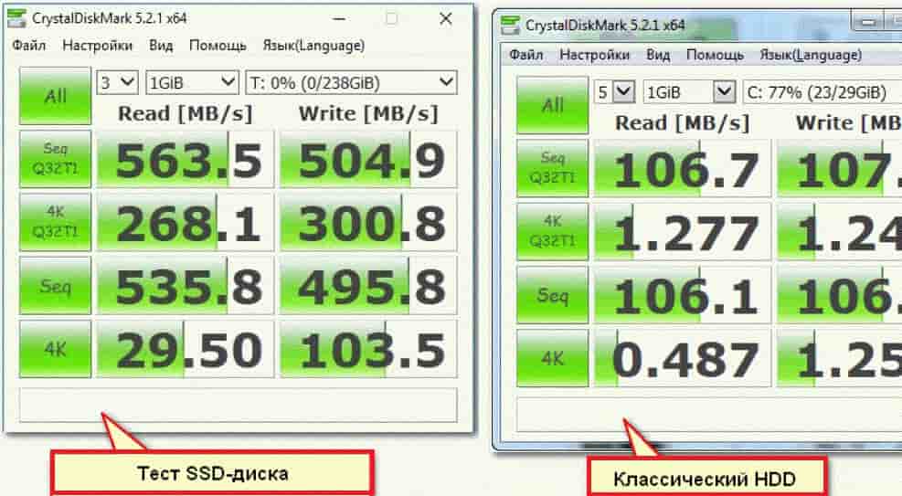 Для того, чтобы наглядно продемонстрировать разницу в скорости работы устройств, достаточно провести сравнительный тест между SSD и HDD с помощью любой диагностической утилиты, например, «CrystalDiskMark».