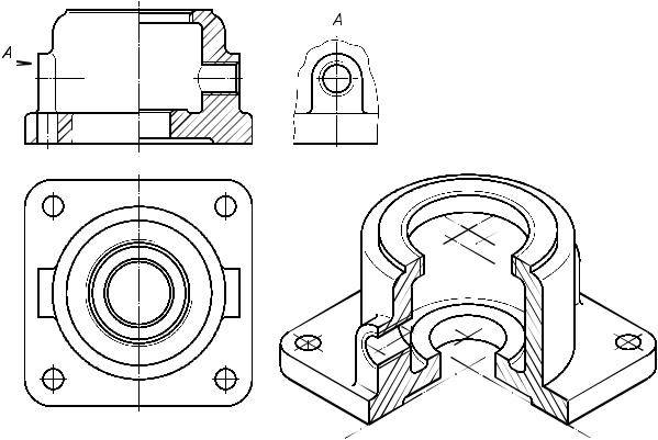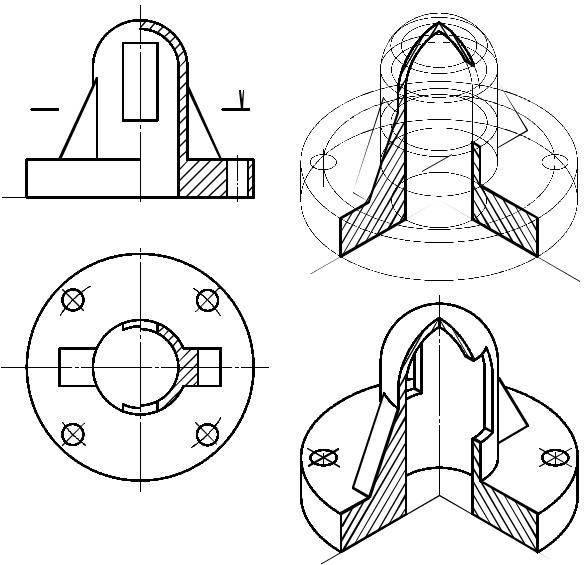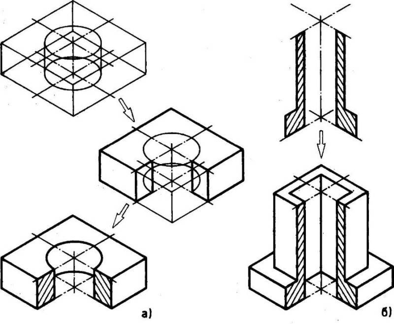 предмета в тонких линиях с последующим нанесением контуров сечений, образуемых каждой секущей плоскостью выреза, и удалением изображения отсеченной части предмета (рис. 6.6б).