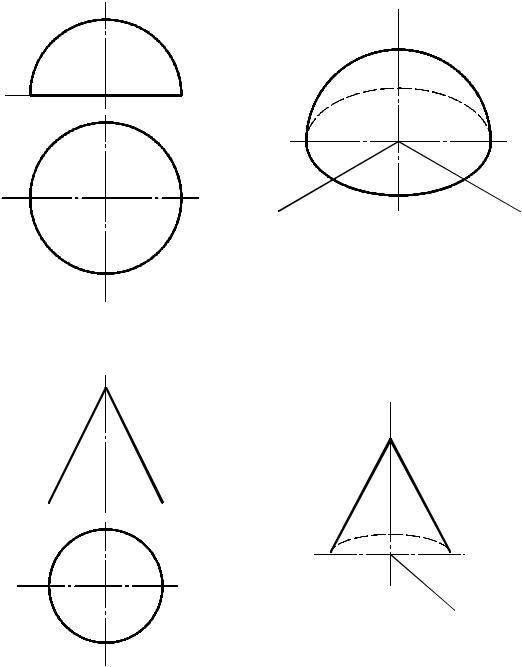 На рис. 6.3а, 6.4а и 6.5а представлены технические чертежи параллелепипеда, полусферы и конуса вращения соответственно, на рис. 6.3б и 6.4б приведены изометрии двух первых фигур, а на рис. 6.5б – диметрия третьей.
