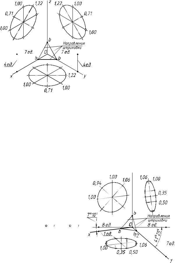 Построение по приведенным показателям искажения эллипсов, в которые проецируются окружности, плоскости которых параллельны координатным, приведено для стандартных изометрии и диметрии на рис. 6.1 и 6.2 соответственно.