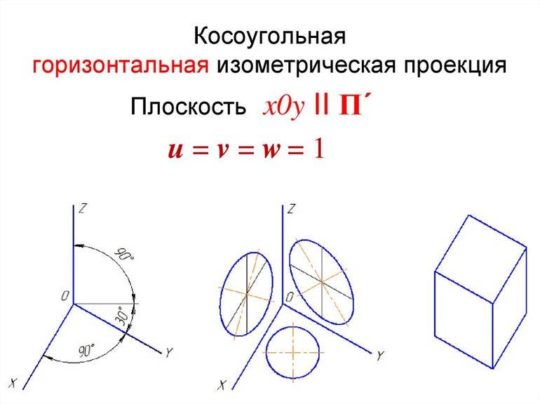 - Горизонтальная косоугольная изометрическая проекция предназначена для изображения детали, расположенной в горизонтальной плоскости. Она часто используется в строительстве при создании наглядных изображений различных сооружений, например, схем трубопроводов.