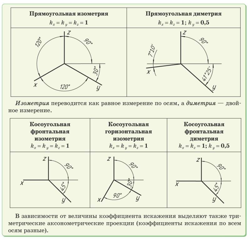 В зависимости от расположения координатных аксонометрических осей относительно аксонометрических проекций получаются различные аксонометрические проекции: прямоугольная изометрическая проекция (сокращенно — изометрия), прямоугольная диметрическая проекция (или диметрия), косоугольные фронтальная и горизонтальная изометрия и фронтальная диметрия.Например, в прямоугольной изометрической проекции оксонометрические оси располагаются по отношению друг к другу под углом 120°.Коэффициенты искажения различны в изометрических и диметрических аксонометрических проекциях. В изометрической проекции коэффициент (k) равен единице, т. е. по осям х, y, z выполняют проекцию без искажения. Диметрическая проекция выполняется с коэффициентом искажения (k) по оси y, равным 0,5, а по осям z и х — равным единице.
