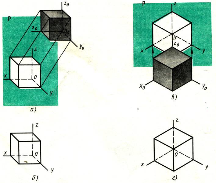 На рис. 83 показаны куб, отнесенные к нему оси прямоугольных координат x, y, z плоскость проекций Р и аксонометрическое изображение куба.