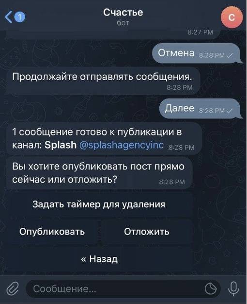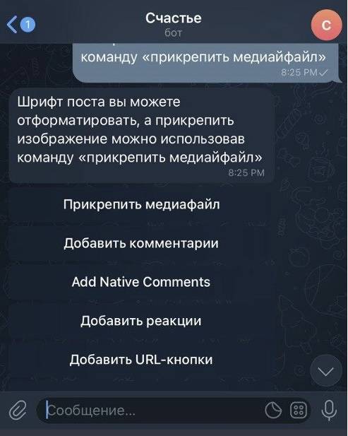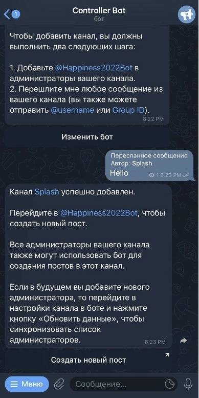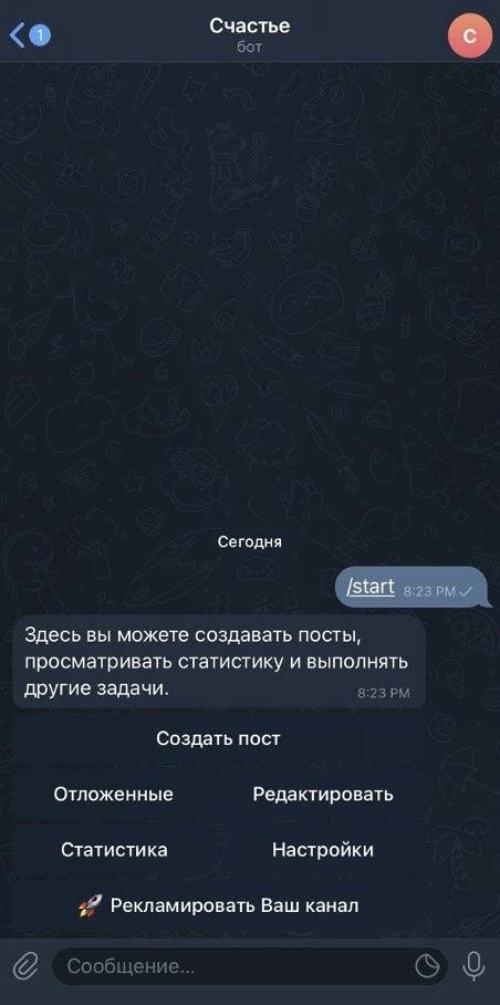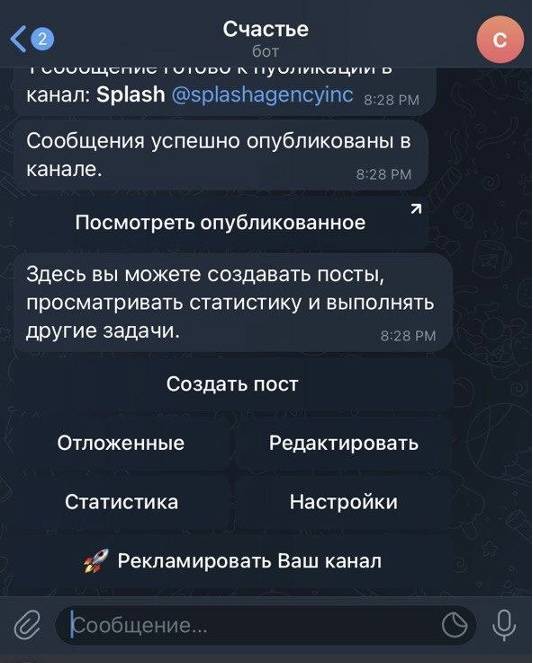 Новый чат-бот можно использовать и в управлении каналом. Например, чтобы создать пост, нужно кликнуть на соответствующую команду. Затем выбрать канал — в нашем случае «Счастье». Далее бот предложит вам «Создать пост».