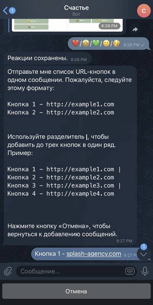 Выбрав команду «Добавить URL-кнопки», вы можете легко сделать такие кнопки. Для этого надо отправить боту сообщение с названием кнопки и ссылкой через дефис.