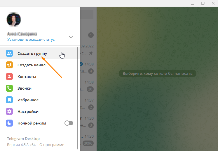 Теперь разберемся, как создать чат в Телеграм-канале. Нажмите на кнопку с тремя черточками в левом верхнем углу приложения Telegram на компьютере или на смартфоне и выберите «Создать группу».