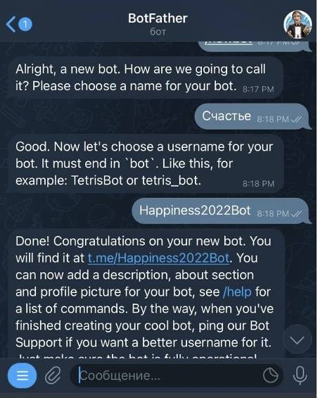 Придумайте своему боту имя, которое будет отражаться в диалоговом списке, и username (уникальный никнейм, который начинается со значка @ и заканчивается на «bot»).
