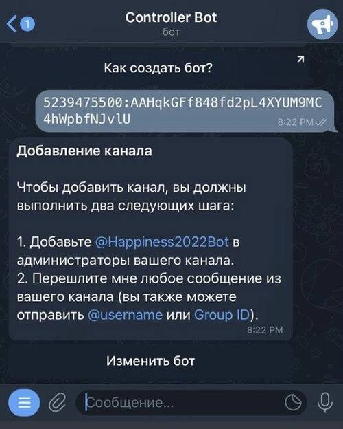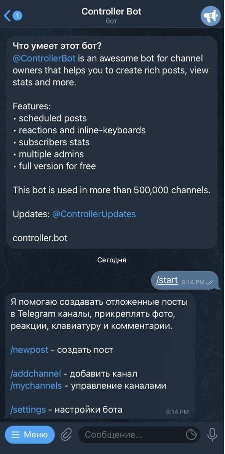 Для начала перейдите в чат с ботом ControllerBot и нажмите «/start» («начать»).