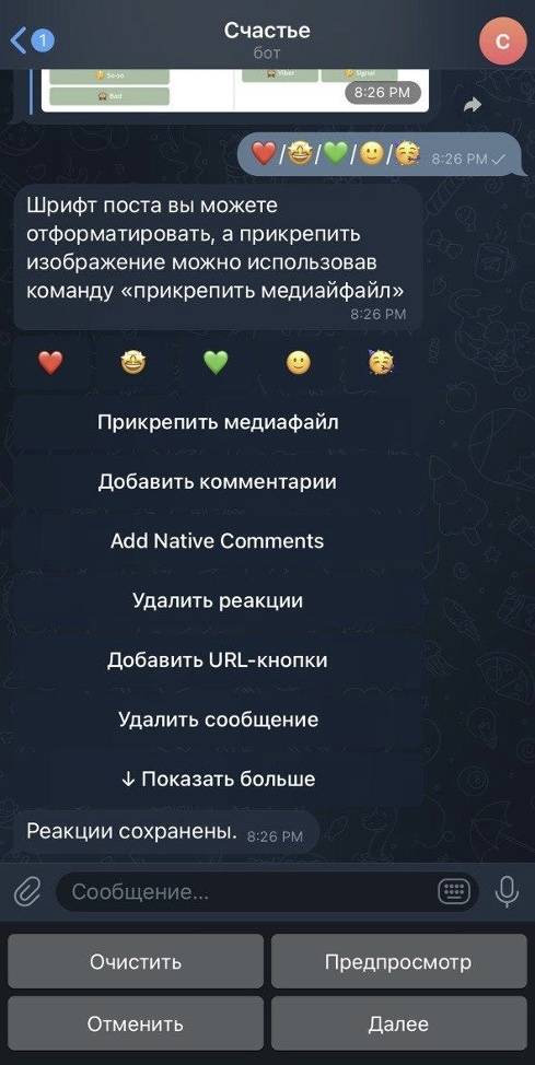 К посту можно также добавить эмодзи, но не больше шести на пост. Для этого нужно кликнуть на «Добавить реакции» и прислать их сообщением через разделитель «/».