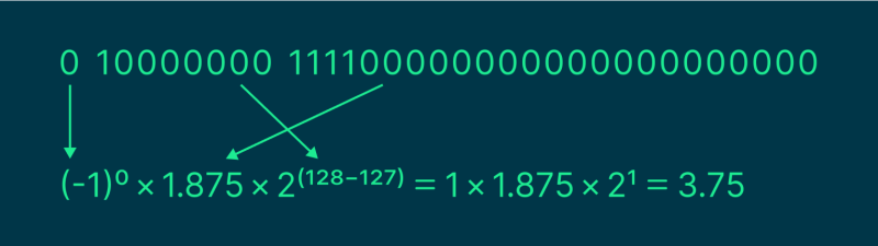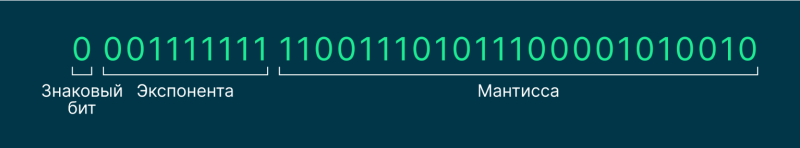 Числа представляются фиксированным количеством битов, каждый из которых отвечает своим задачам. В IEEE 754 обычно используют 32 бита. Они делятся на всё те же категории: один знаковый бит, 7 битов для экспоненты (то, на что мы умножаем мантиссу) и 24 бита для мантиссы (она выражает точность числа).