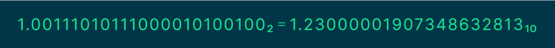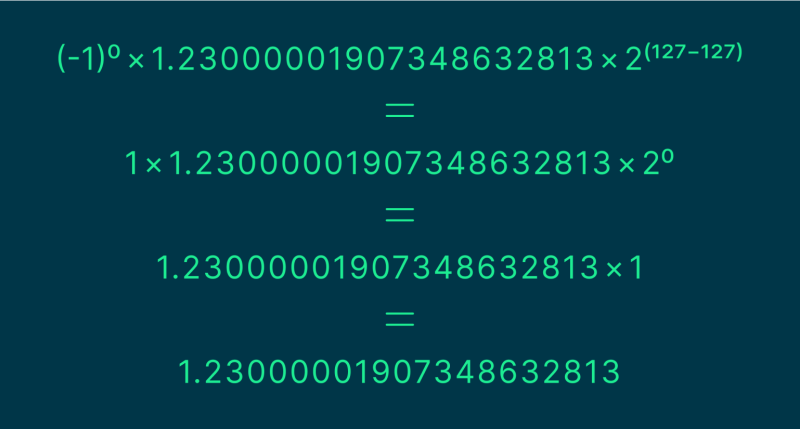 Получили наше число 1.23, но не совсем. То, что вы видите, называется приближением двоичных чисел к десятичным. Если бы у нас было бесконечное количество битов, то мы смогли бы довольно точно представить число 1.23 в двоичной системе, и оно получило бы вид: 1.2300000000000000000000000000000001. Что уже неплохое приближение. Но так как у нас ограниченное число битов, приходится идти на округление.