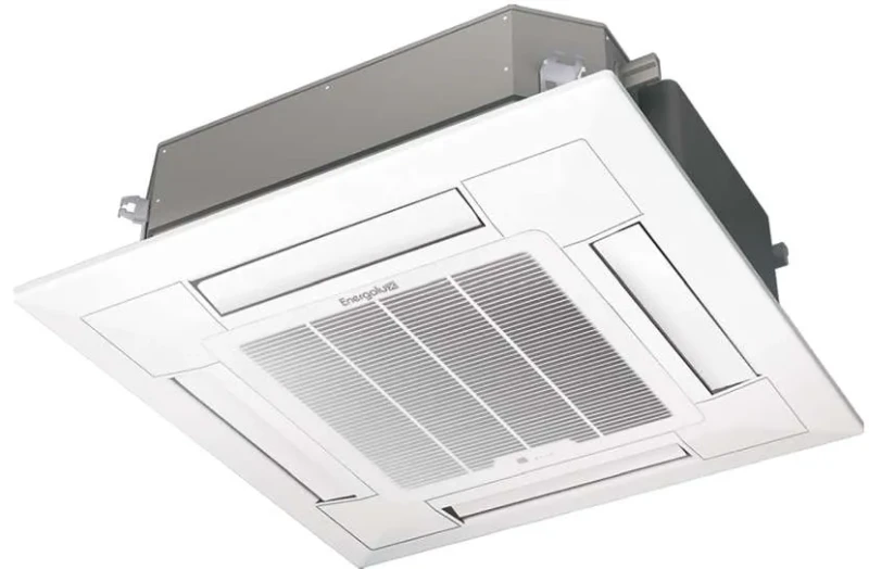 Конструкция кассетного аппарата обеспечивает высокое качество подачи воздуха в больших залах. Это двухблочный тип кондиционеров. Внутренний блок устанавливается на потолке, имеет квадратную форму и большую площадь воздуховодов. Через нижнюю панель подается воздух, а распределительные жалюзи регулируют напор. Чтобы установить такой кондиционер, необходим подвесной потолок, причём межпотолочное пространство должно быть 30–40 см.