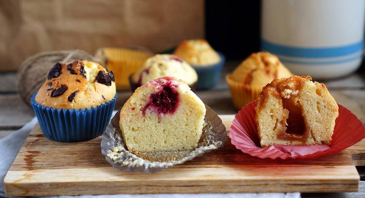 Принцип рецептуры теста здесь в том, что сахара меньше в соотношении с яйцами, молоком и другими жидкими ингредиентами. Кроме того, маффины готовят с наполнителем. Причем наполнитель может быть не только сладкий, но и соленый потому, что эта выпечка позиционирует себя как «мягкий хлеб». Их дополнительно не оформляют сверху кремом, поскольку идеальная форма маффина – пирожное с большой шапочкой наверху. И часто эта шапочка имеет трещины, сквозь которые видна начинка.