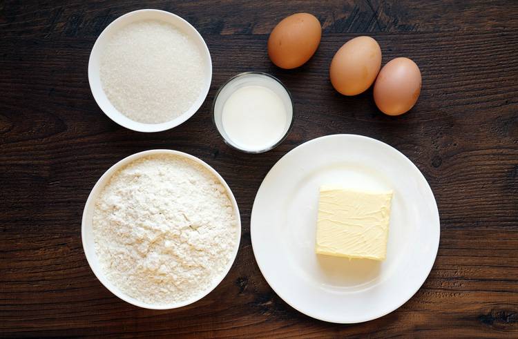 Для приготовления классического кулинарного изделия потребуется: сахар, сливочное масло, яйца, соль, мука, разрыхлитель.
