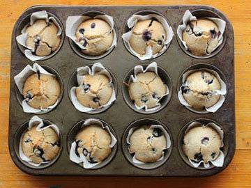 Форма для маффинов металлическая и силиконовая. Выбирайте любой, но смажьте его маслом и поместите внутрь розочку из бумаги для выпечки. Выложить тесто, заполняя только треть объема формы. Чернику необходимо заранее поместить в миску и присыпать небольшим количеством муки, стараясь не повредить целостность ягод.