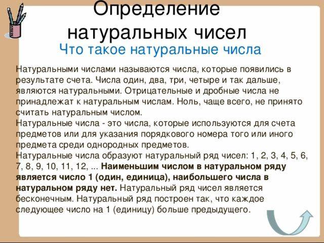Натуральные числа определение – это целые положительные числа. Натуральные числа используют для счета предметов и многих иных целей. Вот эти числа: