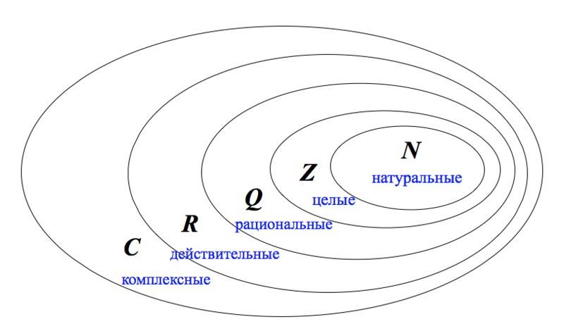 Т. е. множество натуральных чисел входит во множество целых чисел. Множество целых чисел входит во множество рациональных чисел. Множество рациональных чисел входит во множество действительных чисел. А множество действительных чисел входит во множество комплексных чисел.