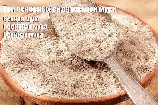 Ржаная мука в кулинарии представлена тремя основными видамиГлавными критериями по которым определяют вид ржаной муки являются количество отрубей в готовом продукте и степень помола зерна. По внешнему виду можно определить, какую концентрацию отрубей имеет продукт. Чем больше отрубей, тем темнее мука. Основная область применения ржаной муки это производство хлеба и различной несладкой выпечки.⚑ Сеяная мука – имеет мелкий помол и не содержит примесей и отрубей. Наделена уникальным ароматом и приятным кремовым цветом. Концентрация пищевых волокон низкая, но всё равно на порядок выше чем у пшеничной.⚑ Обдирная мука – это самый питательный продукт из всех видов ржаной муки содержащий минимум клейковины. Поэтому, для улучшения технических характеристик обдирную смешивают с пшеничной. После измельчения зерна, доля готового продукта на выходе составляет не менее 90%. Приготовленные изделия из такого продукта будут вкусными и полезными.⚑ Обойная (цельнозерновая) мука – производят из зерна не прошедшего никаких стадий очистки. В результате чего все 100% зерна с полезными примесями перерабатываются в муку. Особенностью этого вида являются темный цвет и высокое содержание отрубей. Обойная, также уступает по хлебопекарным свойствам пшеничной, но хранит наибольшее количество полезных витаминов и микроэлементов. В своем составе имеет высокое содержание клетчатки, а также крахмал, железо, кальций, фосфор, магний, витамины Е, В. Используется при выпекании полезных и особых сортов столового хлеба.