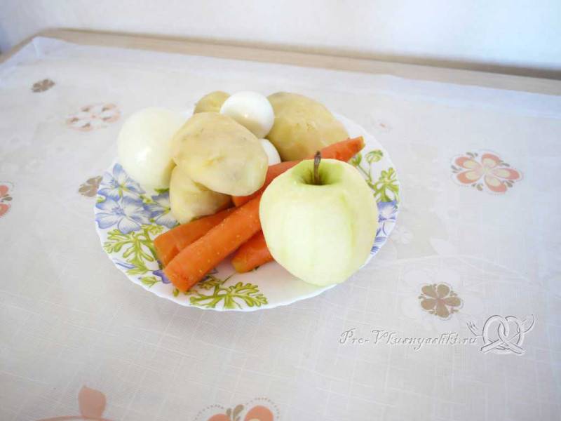 Картофель, морковь, лук и яблоко очищаем от кожуры. У яиц удаляем скорлупу.