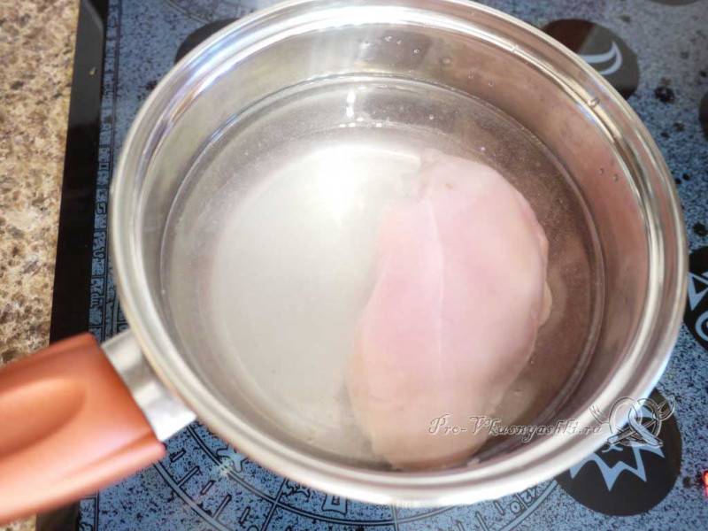 На плиту ставим сотейник с водой и куриным филе (уровень воды должен быть чуть выше мяса), варим на максимальном огне до закипания, затем убавляем до среднего на 20-25 мин (проверяем вилочкой, протыкаем, если сок светлый и нет крови, значит курица готова). Чтобы сохранить максимум пользы, филе птицы лучше опускать в кипящую воду.