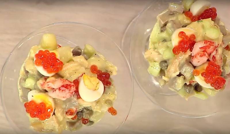 Вот салат оливье классический, воспроизведен подобно подававшемуся в «Эрмитаже» салату. Для него нужен один отварной язык, телячий; паюсная черная икра, 100 грамм; мясо от двух отварных рябчиков; свежий листовой салат, 200 грамм; 25 раков или омар; мелкие порезанные огурчики, пикули, полбанки; яиц отварный пяток; каперсов 100 грамм; немного соевого соуса кабуль, это нежный кетчуп; майонез провансаль, до придания достаточной консистенции салату. Вот так готовился оливье когда-то.