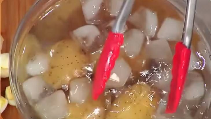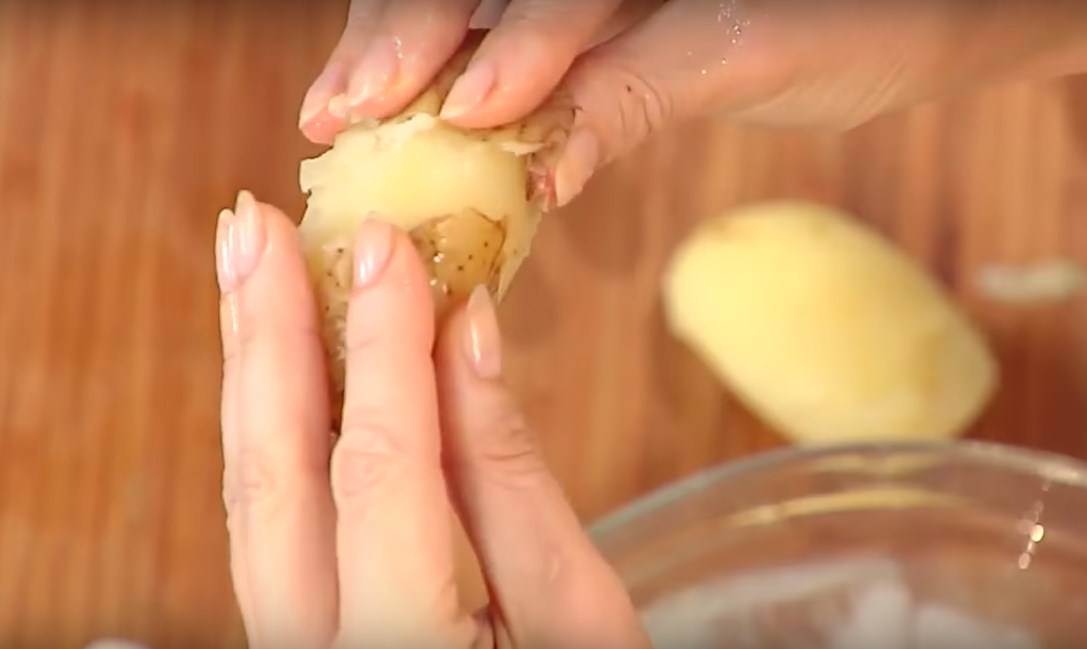 9. Остужаем картофель в ледяной воде несколько минут. Благодаря резкой смене температур, он легко очистится.