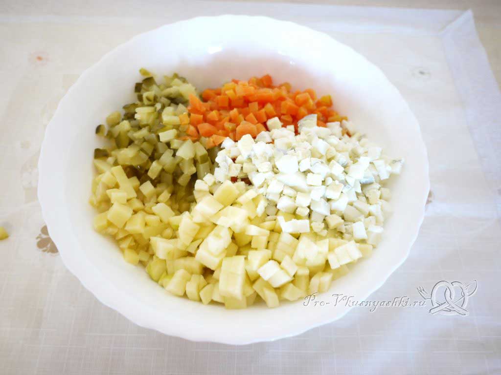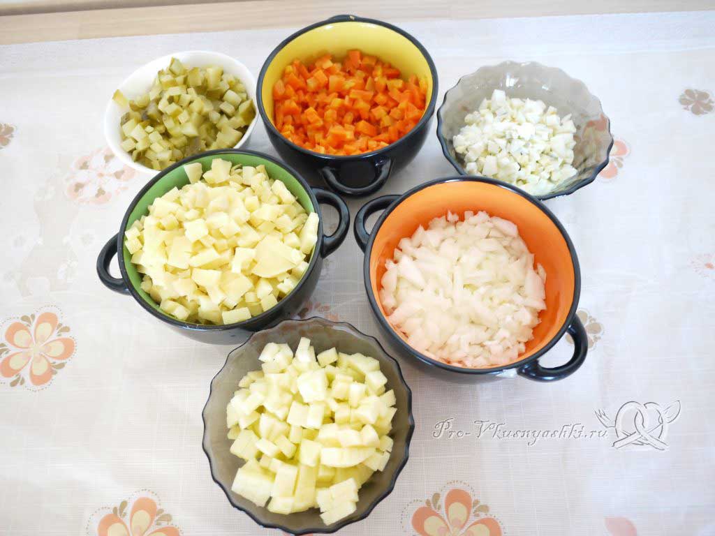 Все ингредиенты: картофель, морковь, лук, соленые огурцы, яблоко и яйца нарезаем мелким кубиком.