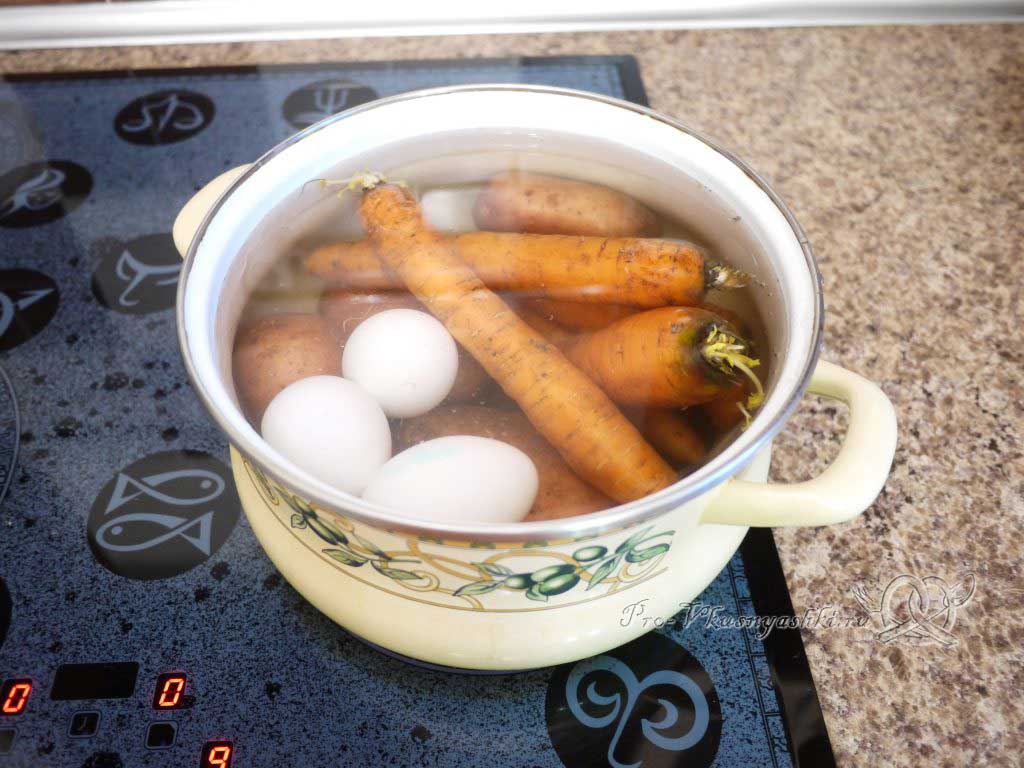 Яйца варим вкрутую — 12 мин после закипания. Время варки картофеля — 15-20 мин (готовность проверяем вилкой, если она легко входит в клубень, значит овощ сварился). Морковь приготовится через 20-25 мин (готовность определяется также как у картофеля).