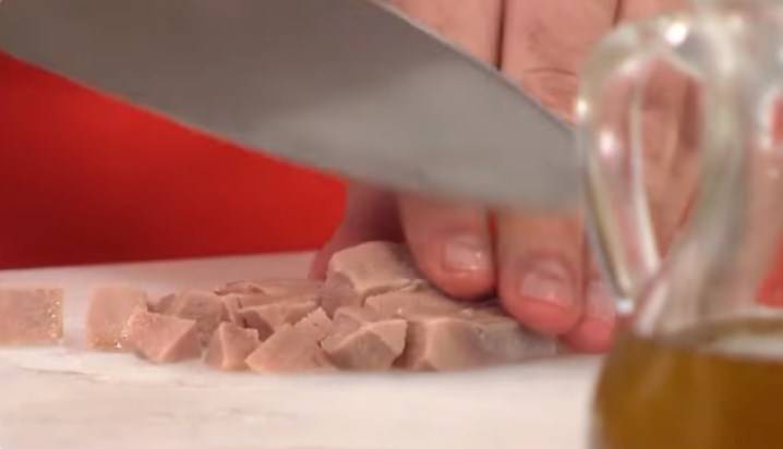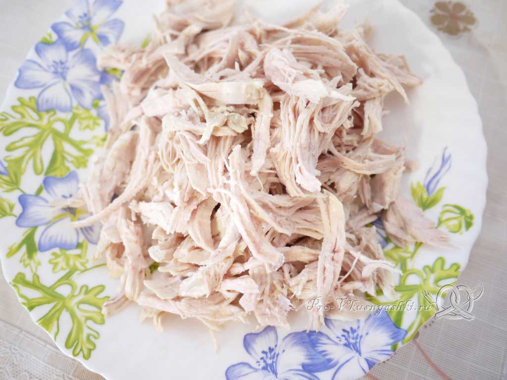 1. Мясо сварить в подсоленной воде и нарезать кубиками.