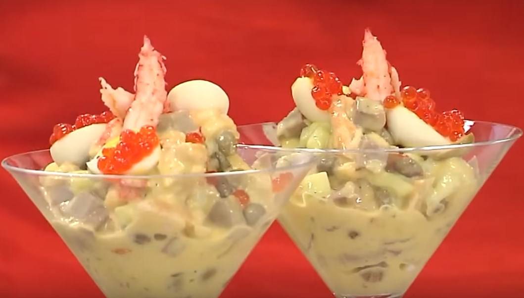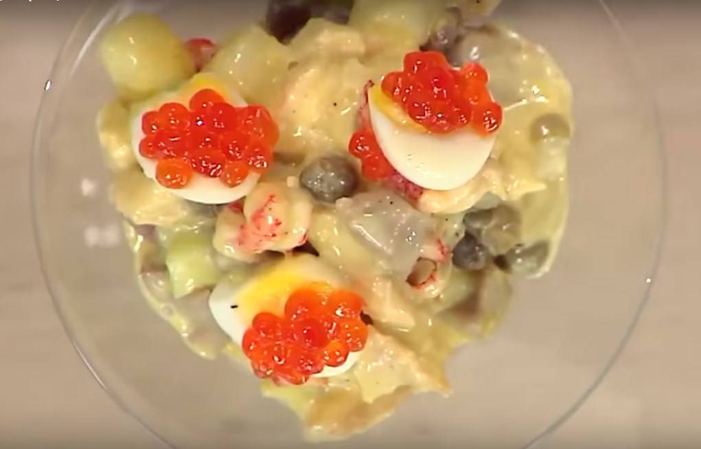 Вот салат оливье классический, воспроизведен подобно подававшемуся в «Эрмитаже» салату. Для него нужен один отварной язык, телячий; паюсная черная икра, 100 грамм; мясо от двух отварных рябчиков; свежий листовой салат, 200 грамм; 25 раков или омар; мелкие порезанные огурчики, пикули, полбанки; яиц отварный пяток; каперсов 100 грамм; немного соевого соуса кабуль, это нежный кетчуп; майонез провансаль, до придания достаточной консистенции салату. Вот так готовился оливье когда-то.
