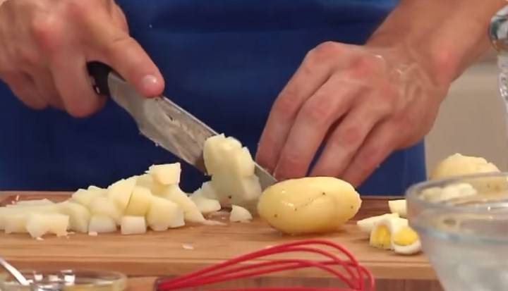 11. Смазываем лезвие ножа растительным маслом, чтобы картофель не крошился. Нарезаем картофель мелкими кубиками.